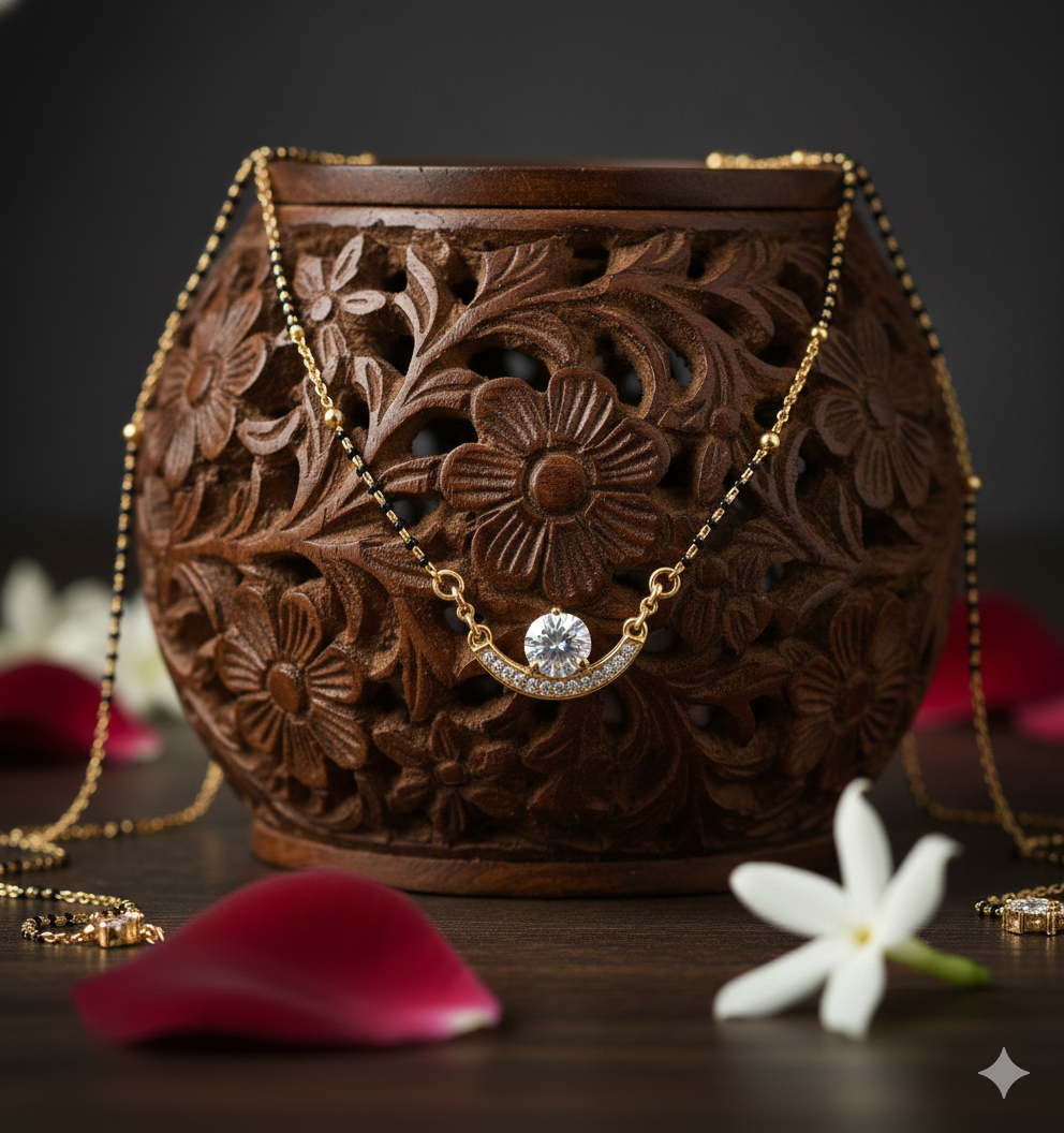 The pendant showcases a brilliant round center stone set within a delicate curved gold base, symbolizing harmony and completeness. The traditional black bead chain preserves the sacred meaning of a mangalsutra while the modern pendant design adds a touch of contemporary charm.